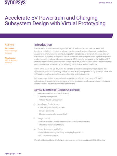 Discover the future of automotive innovation with our white paper on “Accelerate EV Powertrain and Charging Subsystem Design with Virtual Prototyping”.