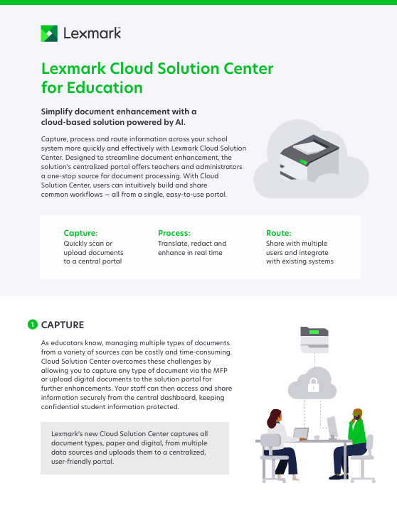 Lexmark Cloud Solution Center for Education Simplify document enhancement with a cloud-based solution powered by AI. Capture, process and route ...