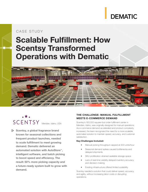 Scentsy is a global leader in fragrance products. As order volumes increased, SKUs expanded, and warehouse space became limited, manual operations could no longer keep pace. To support future growth, Scentsy turned to Dematic — implementing AutoStore™.